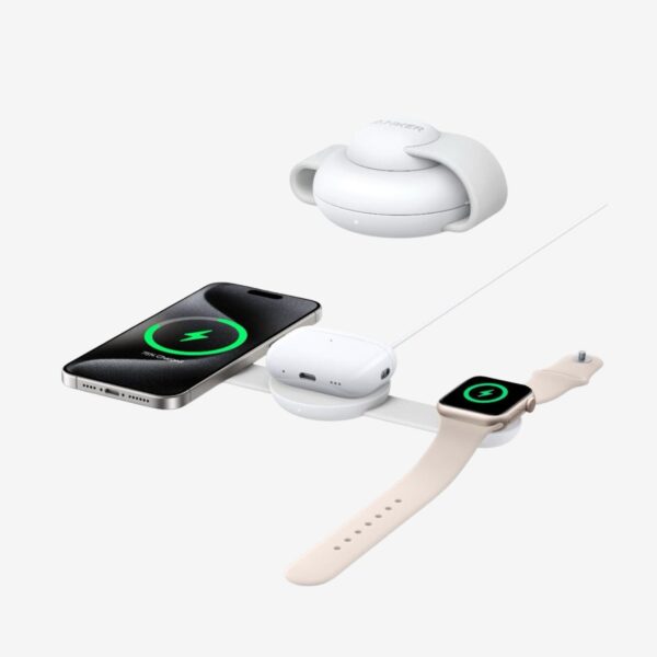 Experience effortless charging with the Anker 3-in-1 MagGo Wireless Charging Pad (B25M8H21) — the ultimate all-in-one power solution for your Apple ecosystem. Designed with sleek precision in a clean white finish, this 15W wireless charging pad efficiently powers your iPhone, Apple Watch, and AirPods simultaneously, ensuring your devices are always ready when you are.