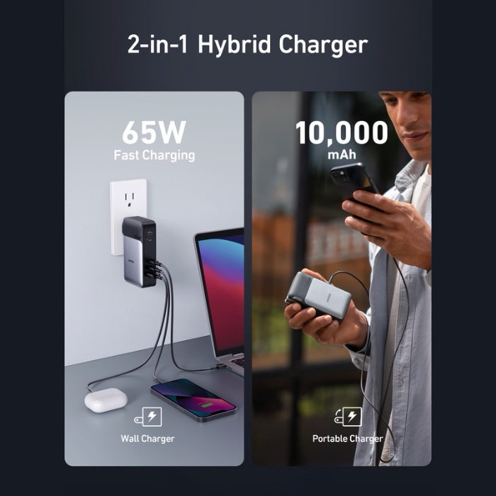 - Package Includes: 10,000mAh 65W 2-in-1 Portable Charger, 0.6 m USB-C to USB-C Cable, Travel Pouch.
