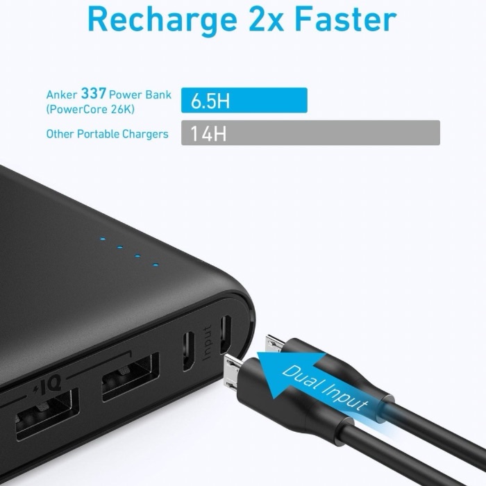 - Dual Micro USB input offers recharge speeds up to twice as fast as standard portable chargers, full recharge takes just over 6 hours while using both input ports
