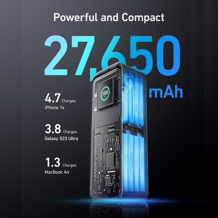- Small Size, Huge Power: The power bank is the size of a soda can with a capacity of 27,650mAh and can charge a 13-inch MacBook Air (M2) 1.28 times or an iPhone 14 approximately 4.67 times. Please know that this power bank is 99.54Wh, which meets the requirements of the TSA(<100Wh) to be taken on airplanes as carry-on baggage.