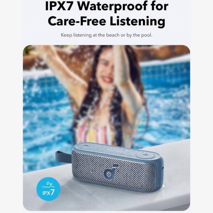 • IPX7 Waterproof: Whether you’re by the pool or at the beach, keep listening without limitations thanks to the IPX7 waterproof rating.