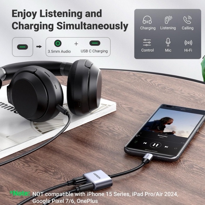 - It is compatible with phones, tablets and laptops that have a USB-C connector . The Ugreen CM193 adapter extends the USB-C connector to a 3.5mm mini jack audio port and a USB-C charging port.