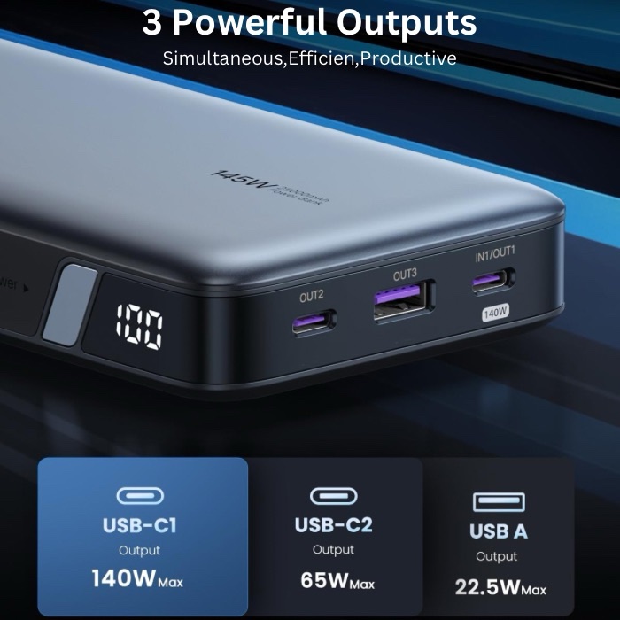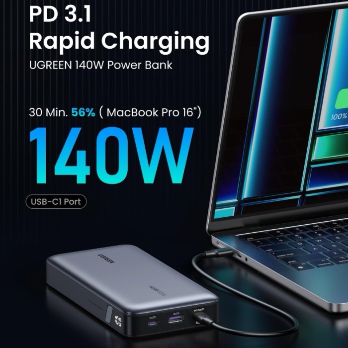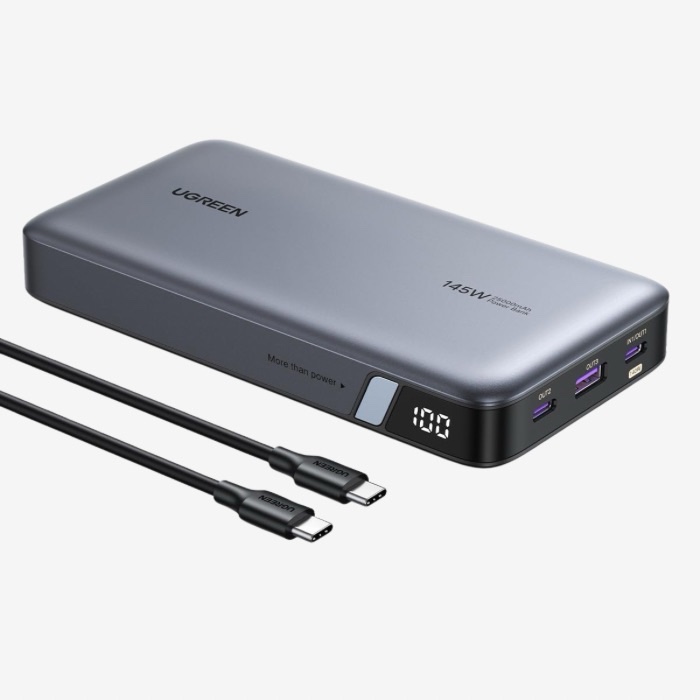 - 145W High-speed Charging :UGREEN Portable Charger Equipped with PD3.0, QC3.0, and capable of 145W of fast charging speed for your Laptop! Fully charge a 2022 13″ Macbook Air in 90 minutes, boost up 50% battery to your iPhone 15 in 20 minutes.