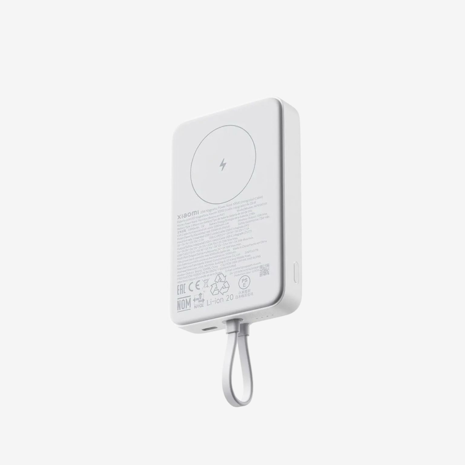 The Xiaomi 33W Magnetic Power Bank 10000mAh with integrated cable combines high capacity and multifunctional charging options in a slim design. Equipped with two 5000 mAh cells (equivalent to 10000 mAh at 3.7 V or 37 Wh), it meets aviation equipment regulations and reliably accompanies users on business trips as well as in everyday life.